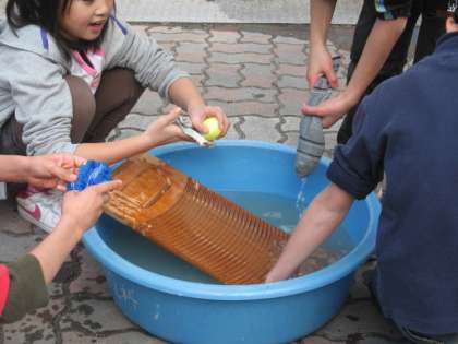 今,3年生は総合的な学習で昔について学習しています。11日(金)は,洗濯板をつかった洗濯をしました。冷たい水にもかかわらず,ごしごしこすって,靴下などをきれいにしました。