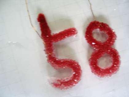 50度くらいの水(湯)200ミリリットルに,ミョウバン60グラムを溶かし,その水溶液の中にモールを吊り下げて1日ゆっくり冷やしていくと,モールのまわりにミョウバンの結晶ができました。