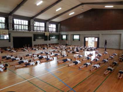 今日は講堂でしたが,友達とぶつからないように間隔に気をつけ行いました。