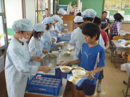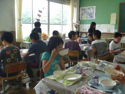 今週,5年生はランチルームで給食を食べました。