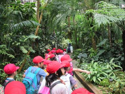 今日は1年生と京都府立植物園に行ってきました。入学しておよそ2カ月の子どもたちですが,道路での歩き方,バスに乗る時や公共施設でのマナー等,しっかりと守って,楽しく出かけることができました。植物園についたころは曇り空で肌寒かったのですが,温室に入ってあたたかさを実感し,植物を観賞しました。その後,バラ園を見学し,京都にちなんだバラの中に,「金閣」や「大文字」を見つけて,嬉しそうにしていました。お昼は,広い芝生の上でお弁当を食べ,元気に遊んでいました。
