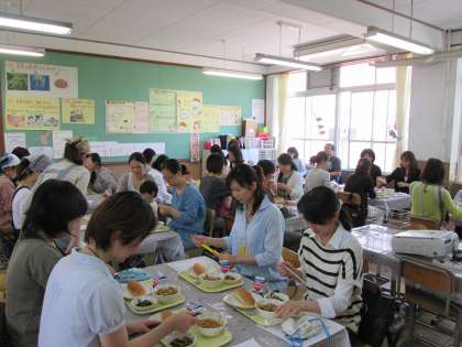 本日,ランチルームにおいて,給食試食会を実施しました。1年生の保護者の方を中心に約30名の方にお越しいただきました。本校の小川久美子栄養教諭より学校給食についてお話をさせていただいた後,1年生の給食の様子をご覧いただき,試食していただきました。今日の献立は,「小型コッペパン」「牛乳」「ソース焼きそば」「小松菜のごま油いため」「チーズ」でした。保護者の方にも好評でした。PTA保健厚生部の皆様には,ご準備等お世話になりありがとうございました。