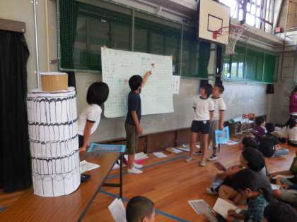「世界遺産グループ」は,ONOKOROのミニチュアワールドに,25分の1になった様々な世界遺産の模型があるため,それにちなんだ調べ学習をしていました。実際にピサの斜塔の模型を作り,「今でも少しずつ傾いているが,約300年は倒れない。」と発表者の人が話しているのを聞いて,「初めて知った!」と真剣にメモを取る様子が見られました。
