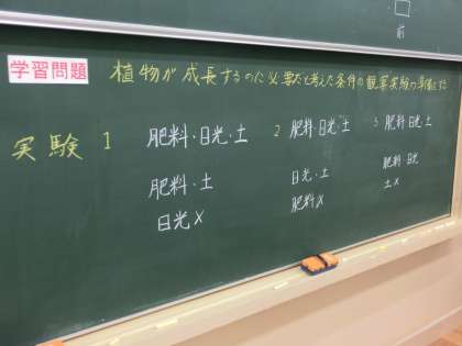 インゲンマメの成長に必要な要素は何なのか。そのことを調べるために,観察実験を行っていきます。今日は,その実験の準備をしました。子どもたちは,班ごとに観察するインゲンマメを準備し,目印をつけたり,予想を立てたりしました。さて,どのような結果となるのでしょう。今から楽しみです。