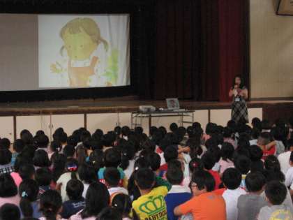 スライドショーを用いながら,「わたしのモンシロチョウ」の読み聞かせを聞きました。「主人公のわたしは,このあとモンシロチョウをどうしたのかな…。」という校長先生の問いかけに子どもたちが答えながら,環境について理解し,環境を守るために自分たちにできることを考えていきます。