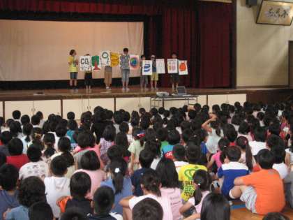 校長先生のお話に引き続いて,環境委員会から「ごみのリサイクル」についての提案をしました。ペットボトルや牛乳パックなど,今までも取り組まれてきたことですが,改めて協力をお願いしました。また,ごみを増やさない努力をすることも大切な心構えであることを,パネルを使ってみんなで確認し合うことができました。