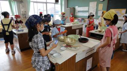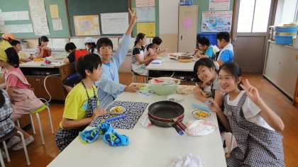 い組で,「朝食のおかずをつくろう」というめあてで,調理実習を行いました。「野菜いため」と「いりたまご」をグループで協力してつくりました。野菜の切り方を教科書の通りに一生懸命切っていました。出来上がると,みんなで楽しく食べました。
