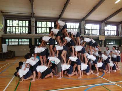 運動会まで土日を除いてあと9日です。6年生の組体操練習もいよいよ最終段階に来ています。この間から全員ピラミッドの練習をしていますが,今日の6時間目,ようやく上手に組み立てられるようになりました。まだまだ練習は必要ですが,子どもたちも手ごたえをつかんでくれたようです。本番まで残りあと少し!TEAM6年,力を合わせてがんばります!!