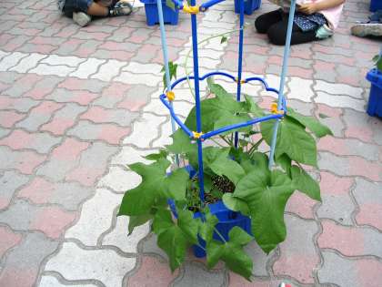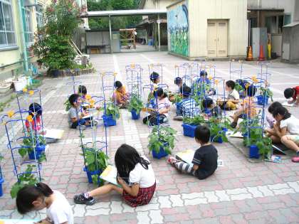 ツルがのび,大きな葉がたくさん増えているのをみて,「どんな花が咲くのだろう」と,子どもたちはとても楽しみにしています。