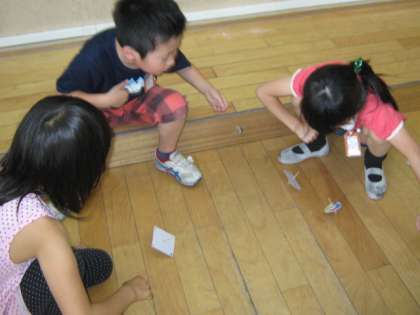 子どもたちは、自分が作ったコマがどれだけ長く回っていられるかの競争に必死でしたが…。