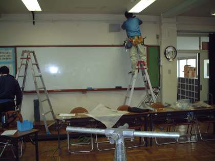 まず,暗くてほとんど何が映っているか見えないプロジェクターを3000ルーメンのものに入れ替え,スクリーンを西側の教壇の後ろに移動します。