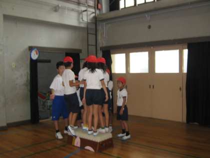 体ほぐしの学習です。人間知恵の輪やフラフープを使って運動したり、協力して跳び箱の上にみんなで乗ったりしました。優しく、上手に中学生に教えてもらって、子どもたちも大喜びの一時間でした。