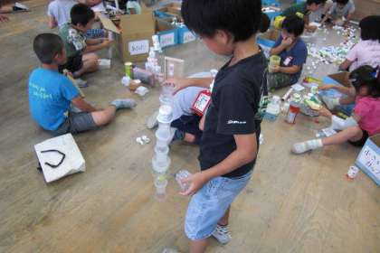 生活科の学習で,身の回りの材料を利用して遊ぶ学習をしています。今,学校にある材料を使って遊びました。