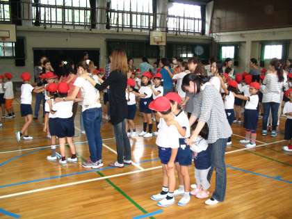 はじめは,じゃんけん列車をして楽しみました。じゃんけんで勝負が決まるたびに,子どもたちも保護者の方も声をあげて,喜んだり悔しがったりしました。最後の勝負が決まると,勝った子どもはガッツポーズで喜んでいました。みんなが一列の列車につながった時は,子どもも大人もみんな笑顔でした。