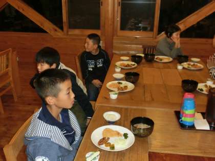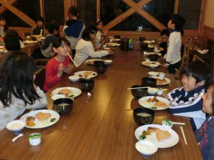 写真は,翠峰荘での食事の様子です。みんなで食べる食事は最高に楽しいです。ごちそうさまでした。