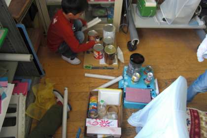 生活科の学習で,集めた材料を使って,遊ぶ道具を作っています。「楽器作りチーム」と「ゲーム作りチーム」に分かれて作っています。