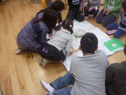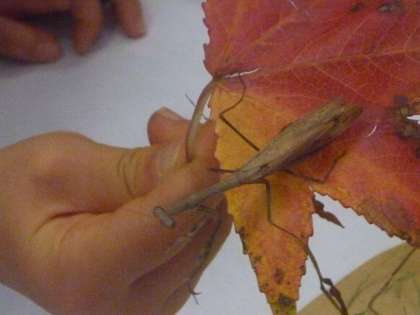 虫探しで見つけた虫を観察しました。かまきりの動きや顔などを近くで見ました。顔の形が逆三角形であることや,かまに毛が生えていることなどを発見していました。観察したりさわったりすることで,虫となかよしになりました。