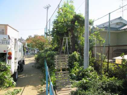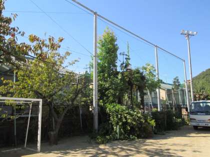 運動場の南側のフェンス沿いの樹木の枝が伸びて,防球ネットを通り越し,落ち葉等で地域の皆様方にご迷惑をおかけしていました。そこで,業者の方にお願いして,樹木を剪定していただきました。見通しもよくなり,とてもすっきりしました。