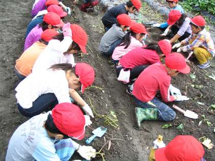 七彩の風の職員の方にいもの掘り方を教えていただき,子どもたち全員が自分のいもを掘ることができました。子どもたちは自分で掘ったいもを見て,うれしそうに笑っていました。掘ったいもは家から持って来た袋に入れて,持って帰りました。