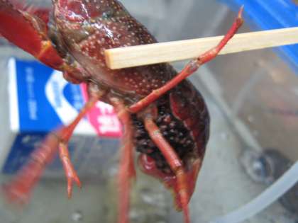 空気ポンプを入れた水槽にたまごがついているザリガニを集め