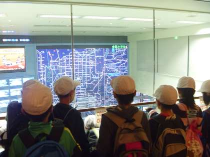 警察官の方々がどのようにしてわたしたちの安全を守ってくださっているのか,府警本部の裏側も見せていただきました。見学している間にも,事故や事件の件数がどんどん増えていく様子を見て,子どもたちは驚いていました。