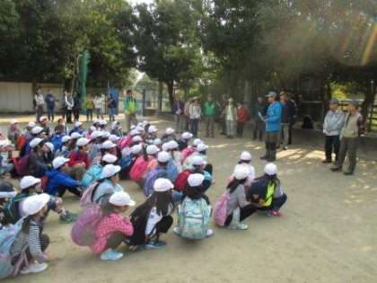 写真は、出発式で森林インストラクターの方々、引率に参加してくださった保護者の方々との対面の様子です。