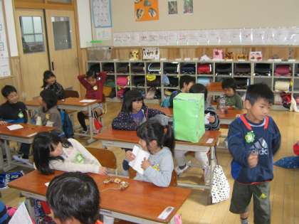 今日の生活科の学習では,自分たちが作った作品を他のクラスのお友達とも伝え合うといった活動を行いました。今まで見ることのできなかった違うクラスのお友達の作品を見て,子どもたちも「すごいなぁ!」,「おもしろそう!」,「やってみたい!」ととても楽しみながら交流することができました。