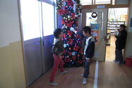 昨日飾っていただいたクリスマスツリーが,大人気です。たくさんの子が図書室を訪れるので,子どもの目に触れ,よい場所に飾っていただいたと喜んでいます。