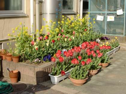 花壇には色とりどりの花が咲いていて、あったかい気持ちにさせてくれています。