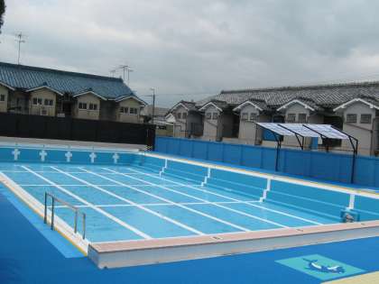 冬の間,地域のみな様にご迷惑をおかけいたしておりましたプールの工事が完了いたしました。真新しいプールは,水槽と共にプールサイドや腰洗いそうシャワーすべて水色で統一しスカイブルーの鮮やかなプールに生まれ変わりました。
