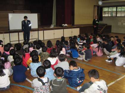 4月13日(火)本校体育館で1年生とにじの子学級の児童を対象に,「交通安全教室」を実施しました。京都府警察北署の方に来ていただき,子どもたちのわかりやすく,安全な道の歩き方や,自分の命を守る大切さについてお話をいただきました。