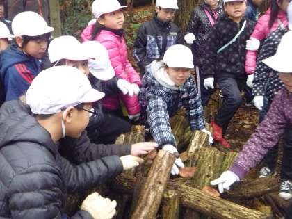衣笠山には,きのこもたくさんあります。数年前に菌うちしたしいたけの様子も見てきました。しいたけの苦手な子どもたちも多いですが,実際に触ったり匂いだりして,とても嬉しそうでした。
