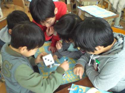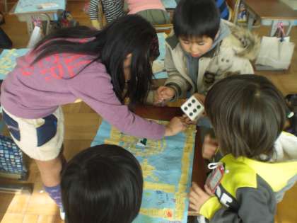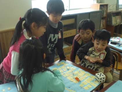 ワープするマスがあったり,早口言葉を言うマスがあったり,それぞれが工夫して作ったすごろくで,子どもたちはとても楽しみながら仲良く遊んでいました。