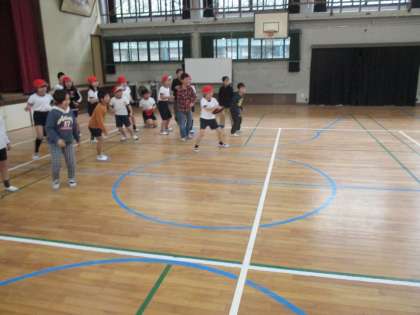 講堂でドッヂビーをしました。