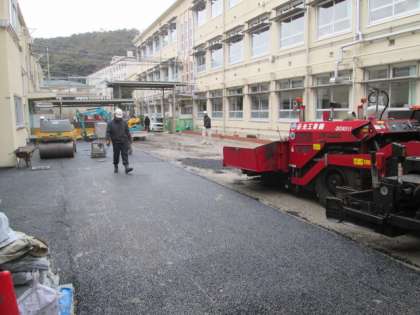 中庭にアスファルトを敷く工事をしていただいています。ここは,最終的には人工芝敷きになります。2月末ごろの予定だそうです。早く中庭で遊べるようになってほしいです。