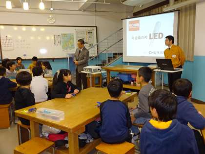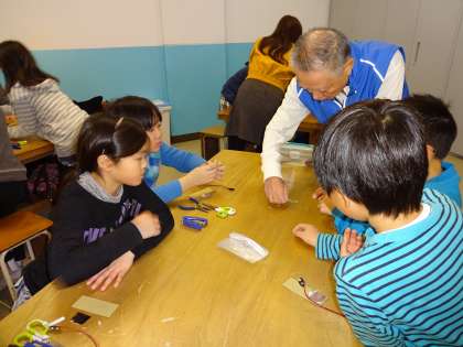 2つのグループに分かれ,1つはモノづくり工房体験学習を行いました。初め,子ども達は,何を作るのか分からずロームの方が説明される通りに一生懸命に作っていました。作り方が分からない時は,モノづくりレンジャーの方々に教えていただきながら進めて行きました。