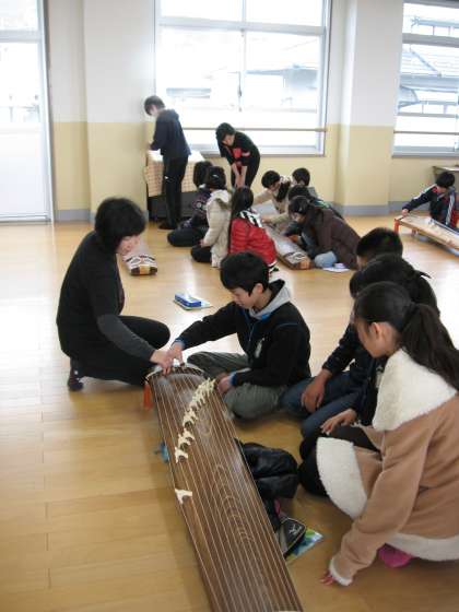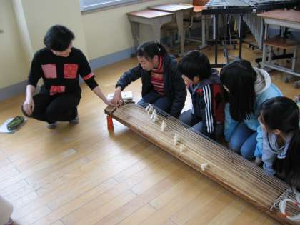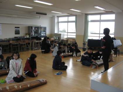 講師の方をお招きして6年生がお琴の演奏の仕方について教わりました。「さくら」の曲を題材に4人1組になって実際にお琴に触れ,指で弾いてみて音を奏でました。美しい音色をお伝えできないのが残念ですが,2小節ずつに区切って練習しました。最後に講師の先生がアレンジされた曲の生演奏を聴かせていただくことができました。