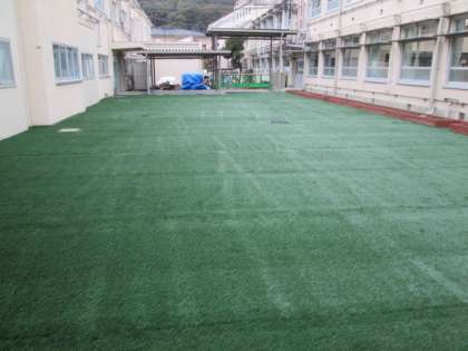 昨日,ついに中庭に人工芝を敷いていただきました。渡り廊下を通る子どもたちも,興味津々です。手を伸ばしてついさわってしまう子も。3月末まで,まだ使うことはできないのですが,人工芝が張られた中庭はとても美しくて,見ているだけでもとても幸せな気持ちになれます。