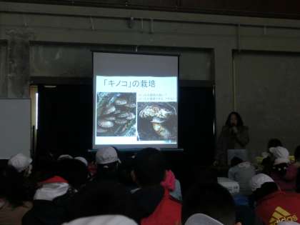 まず,インストラクターの方からキノコについての講義を聞き,その後,ドリルでほだ木に穴を開け,菌打ちを行いました。子どもたちにとっては滅多とない体験です。「こんな風に菌打ちをして,キノコを栽培するのか」ということを,子どもたちは初めて知ることができました(私たちも初めて知りました)。グループで協力しながら,楽しく活動していました。