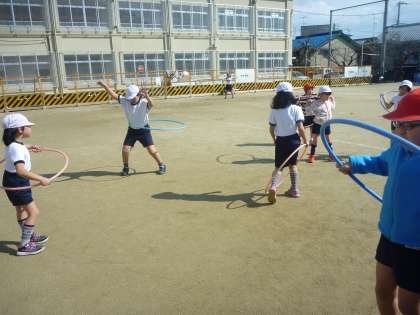 体育では用具遊びをしています。フラフープを腰で回したり,なわとびみたいに跳んだりしています。その後に2つのチームに分かれてどんじゃんけんをしました。フラフープにあわせてケンケンパで進むのが少し難しく苦労している子どももいましたが,楽しんでいました。