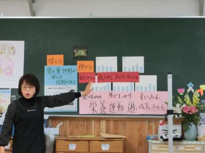 計測の前に,保健室の中村先生から「骨の成長」についての大切な話をしていただきました。丈夫な骨をつくるためには,「好き嫌いなくなんでも食べ,早寝をして,運動をすることが大切だ」ということを知ることができました。