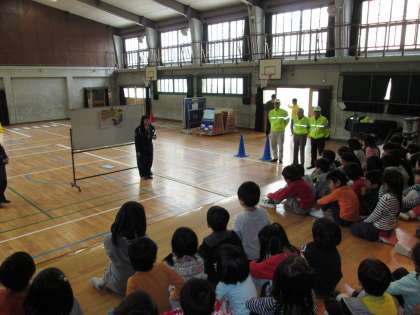 毎年,北警察署の方に来ていただき、1年生が安全に登下校できるように指導していただいています。交通対策協議会からも3名の方にお越しいただきました。
