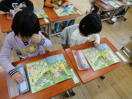 算数科の学習では,『かずとすうじ』という単元の学習をしています。数図ブロックを使いながら,一生懸命学習に取り組んでいます。1から5までの数字を書くことができるようにもなりました。