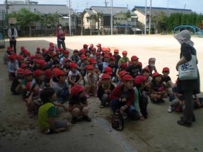 運動場に集合して,たんけんの諸注意を確認し,いよいよ出発です。