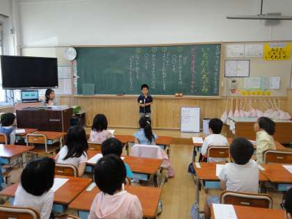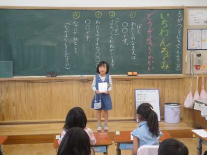 練習をした自己紹介をみんなの前に立ってすることができました。初めて,長い文章で自己紹介をしたので,子どもたちはとても緊張した様子でした。また,見ている子どもたちうもしっかりと相手の方を見て自己紹介を聞くことができました。