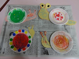 図工の時間に、6月をイメージして「ゆめみるかたつむり」を作りました。紙皿と画用紙を使い、それぞれが思うように模様を描いたり、色を塗ったりしました。とてもすてきな、個性あふれる作品ができました。
