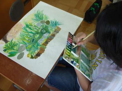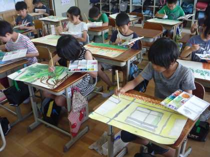 図画工作の時間に,学校の中の風景を写生しています。細かいところまで気を付け,また,色づかいを工夫して,いっしょうけんめい取り組んでいます。完成間近なので,作品の仕上がりが楽しみです!