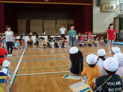 2時間目は講堂でみんなで歌を歌ったり、2年生が1年生の間にできるようになった一輪車やけん玉などを見せてもらったりしました。