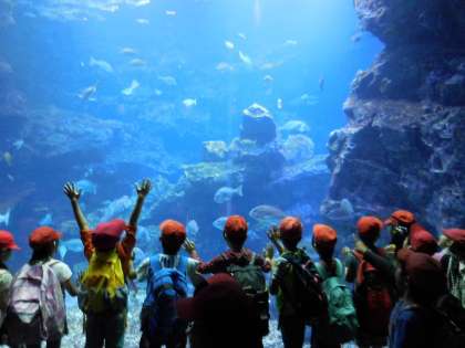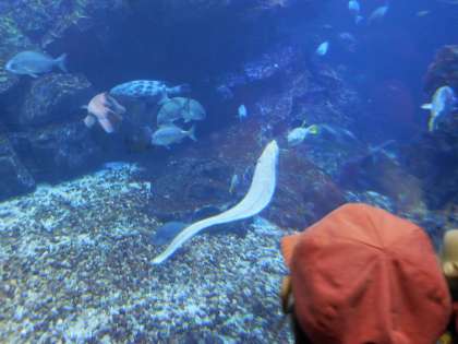 ウツボやエイ,カメ,たくさんの魚が同じ水槽の中で優雅に泳いでいました。