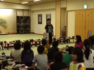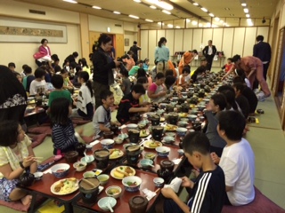 お風呂を済ませて,大広間で夕食をいただいています。今日一日,はりきって活動したので,おなかもぺこぺこです。みんなで食べるごちそうの味は,きっと格別でしょうね。